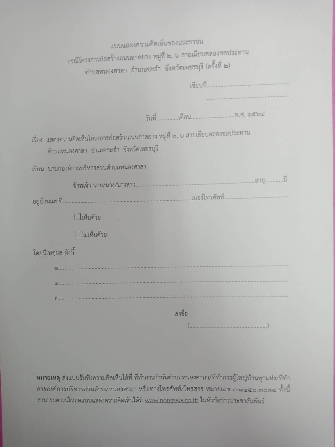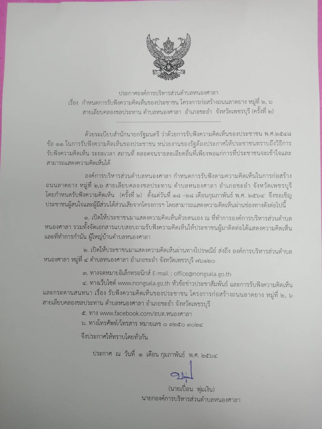 อบต.หนองศาลา อำเภอชะอำ จังหวัดเพชรบุรี เปิดรับฟังความคิดเห็นของประชาชน โครงการก่อสร้างถนนลาดยาง หมู่ที่ 2, 6 สายเลียบคลองชลประทาน ตำบลหนองศาลา อำเภอชะอำ จังหวัดเพชรบุรี (ครั้งที่ 2)